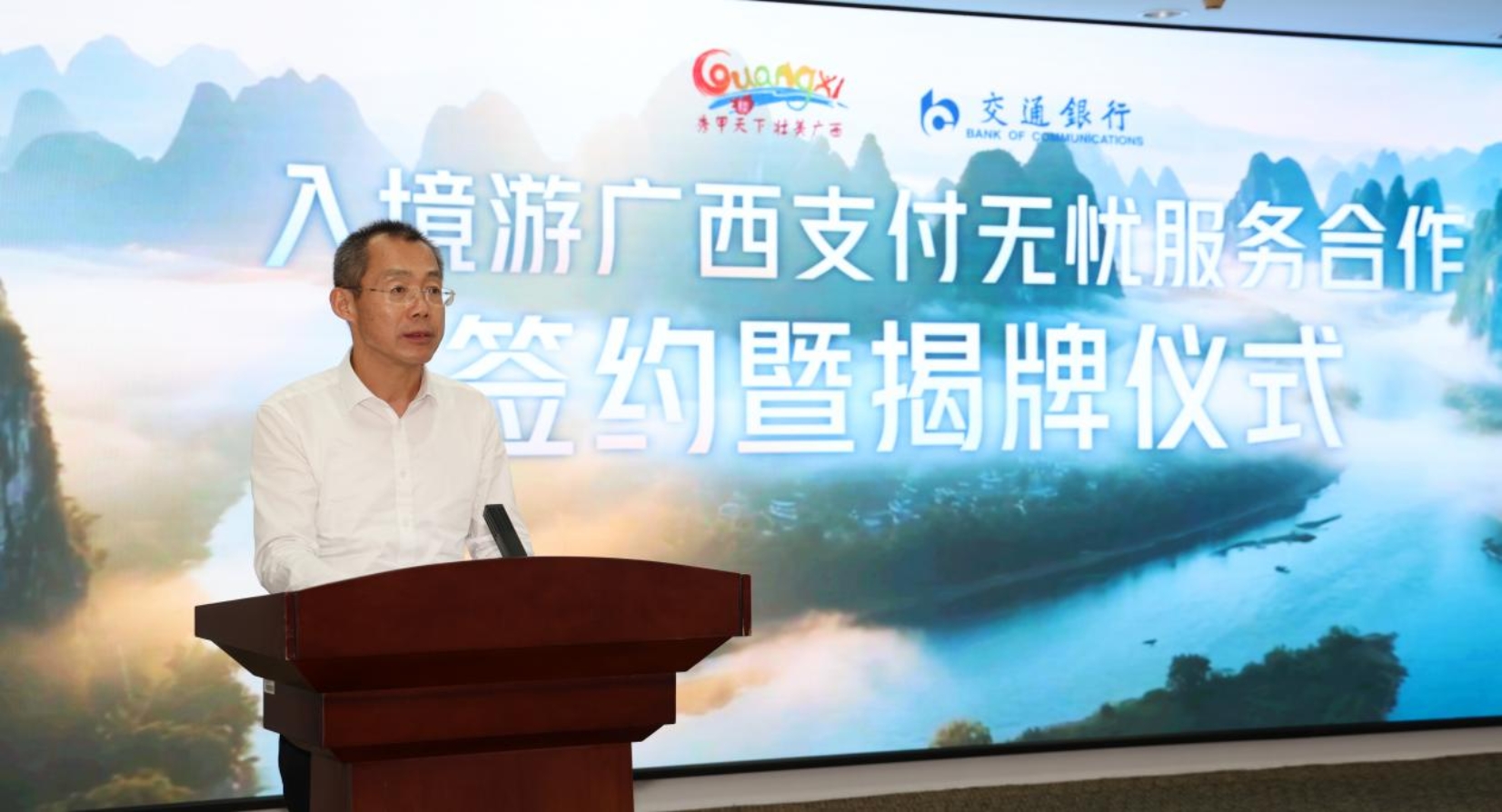 9月19日,由自治区文化和旅游厅与交通银行广西区分行携手打造的入境游广西支付无忧服务合作签约暨“GX-TravelEase Bank+”旅游金融服务网点揭牌仪式在交通银行桂林分行圆满举行。交通银行党委委员、副行长兼首席信息官钱斌,自治区文化和旅游厅党组书记韩流出席活动并致辞。桂林市委书记李楚,交通银行广西区分行党委书记、行长官惠宣,中国人民银行广西区分行党委委员、副行长杨正东等领导出席活动。