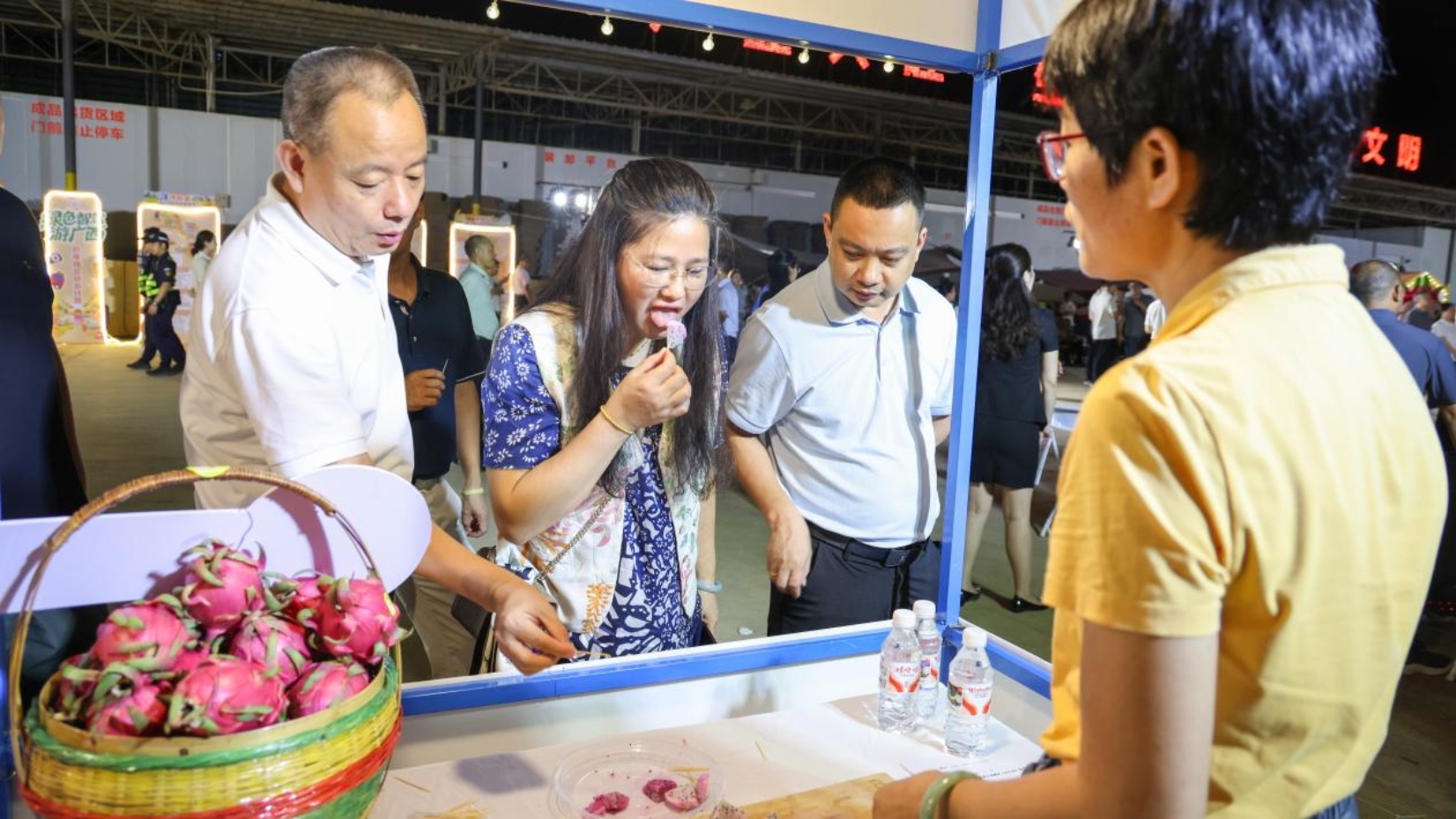 其中,隆安本地特产红心火龙果凭借清甜多汁的口感、饱满鲜亮的品相成为当晚的爆款产品。特色鲜明的“喵小桂”文创商品在万亩星河中同样引人注目,吸引众多游客扫码选购。